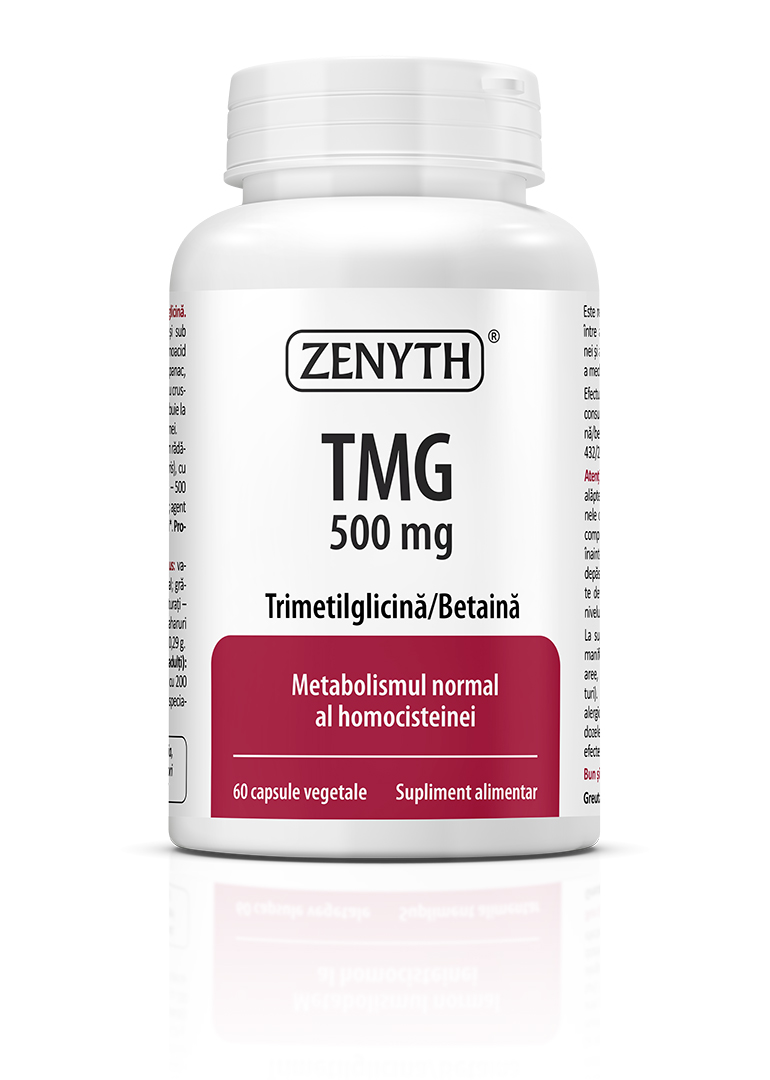 TMG 500 mg de la Zenyth este un supliment alimentar cu trimetilglicina sau betaina din sfecla. Trimetilglicina (TMG), cunoscuta si sub numele de betaina, este un aminoacid care se gaseste in vegetale (sfecla, spanac, quinoa), produse din carne, fungi si crustacee si care contribuie la prevenirea bolilor de inima, avand efect antioxidant si favorizand cresterea productiei de energie. In organismul uman, trimetilglicina sau betaina se formeaza in mod natural prin descompunerea colinei. Cu alte cuvinte, colina este „precursor“ de trimetilglicina/betaina. Colina trebuie sa fie prezenta pentru ca trimetilglicina/betaina sa fie sintetizata in organism. Similar vitaminelor B, inclusiv folatul si B12, betaina este un donator de metil. Acest lucru inseamna ca betaina este esentiala pentru functionarea optima a ficatului, pentru detoxifiere, pentru buna functionare a nervilor, creierului, activitatii musculare, pentru mentinerea nivelului de energie si nu numai. Trimetilglicina/betaina are un rol crucial in procesare grasimilor in corp. Aceasta donare a unei grupari metil catre alte molecule poarta numele de proces de metilare si poate accelera sau mentine in organism procesele normale de biosinteza a hormonilor, neurotransmitatorilor, acizilor nucleici, proteinelor, fosfolipidelor etc.